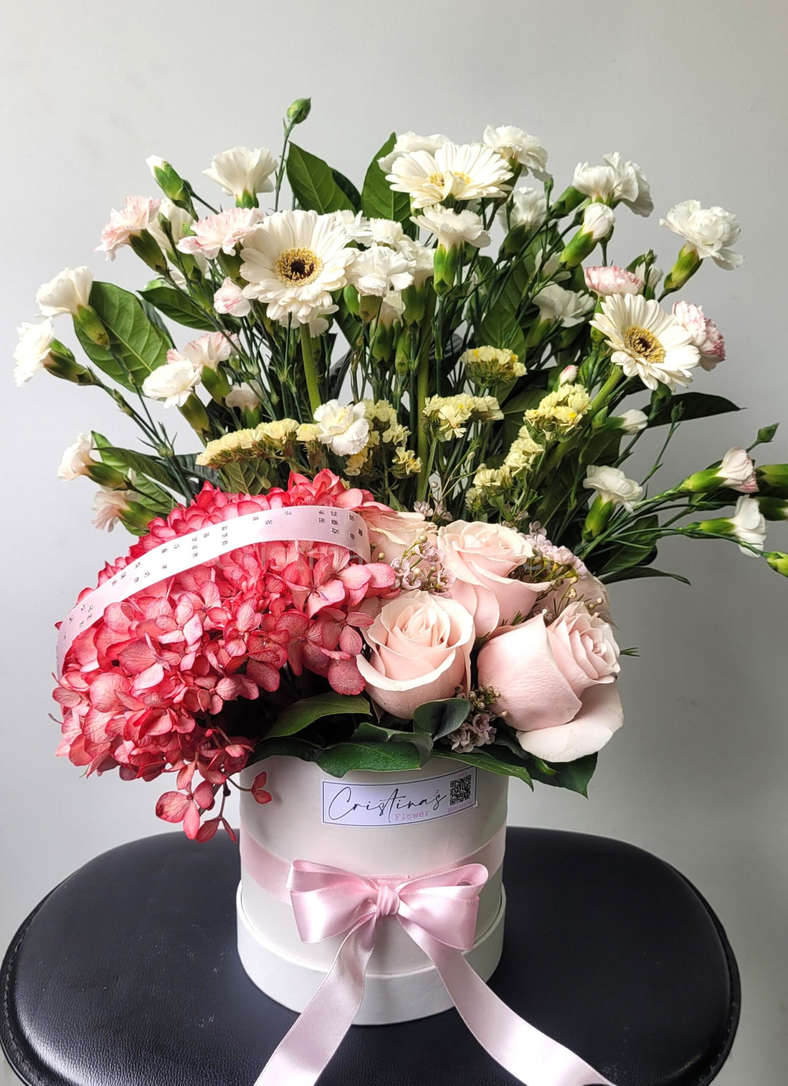 Arreglo de hortensia y 5 rosas, wax, statis, claveles 2 tonos, 3 mini gerberas y follaje de estación. Incluye cinta con la frase ¨Felíz Cumpleaños¨.