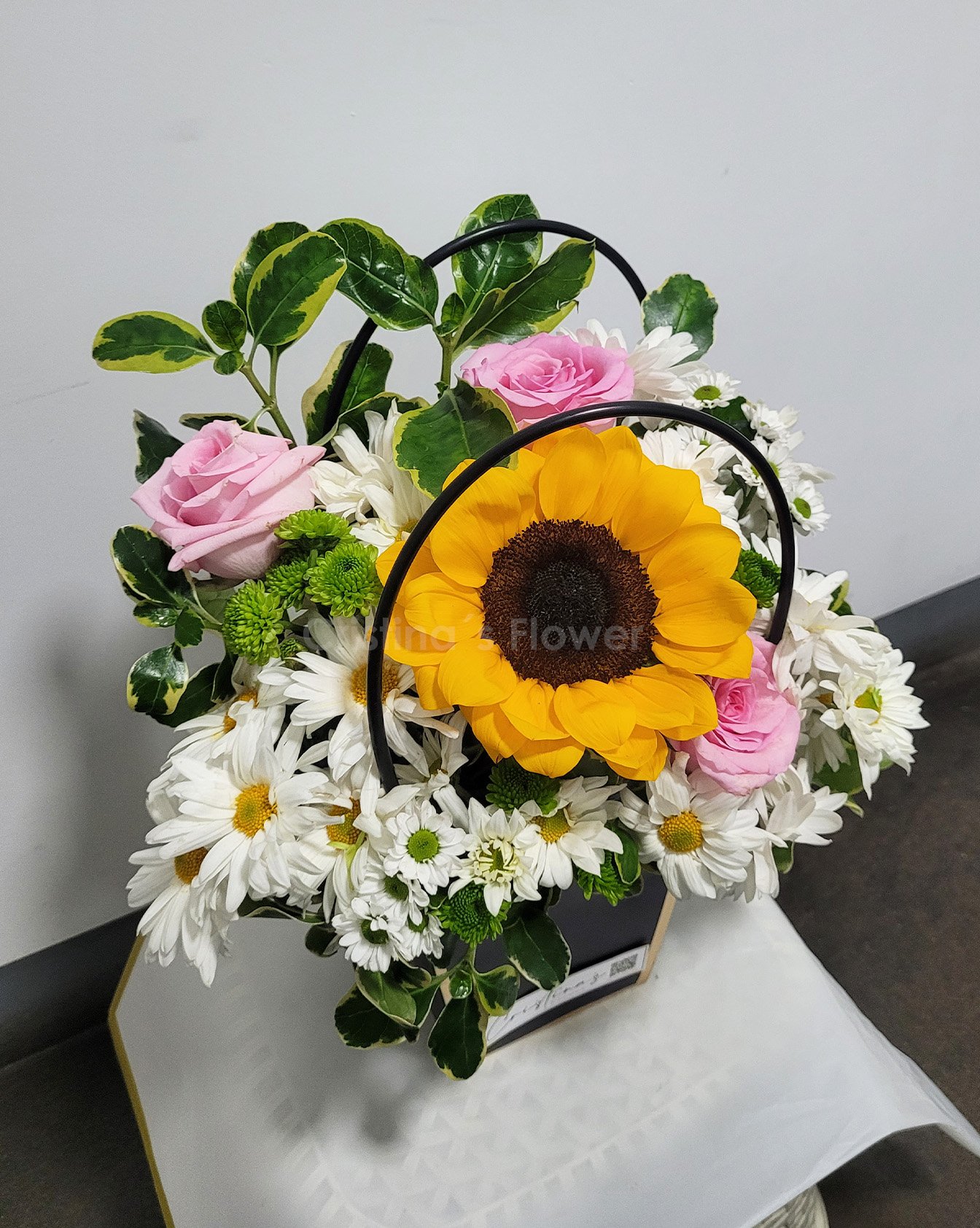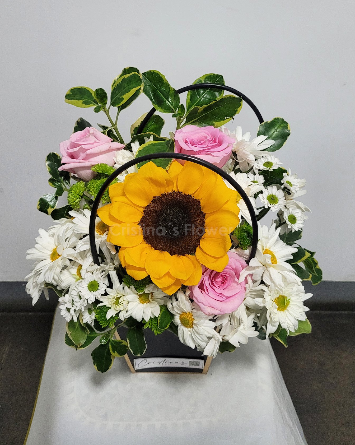 Bolsa Floral de 1 Girasol acompañado de 3 rosas rosadas (el tono del rosado puede variar según stock), margaritas blancas, botones verdes, detalles de Santa Marías y follaje de estación.