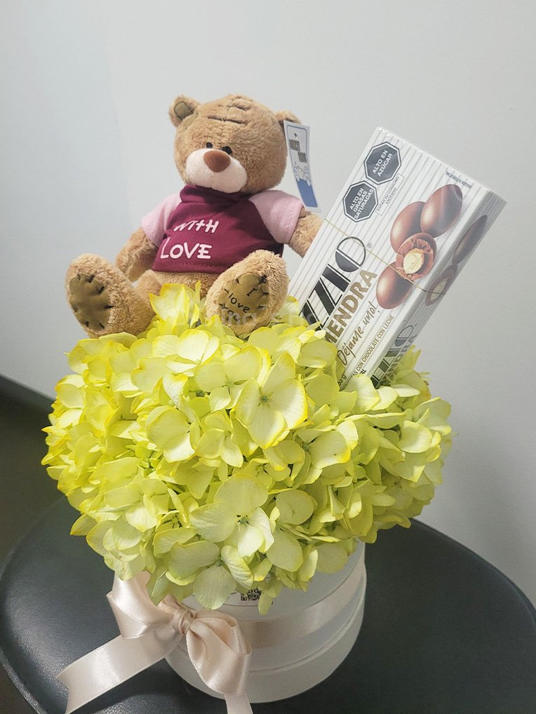 Box 1 Hortensia, acompañado de osito y 1 caja de chocolates Vizzio.