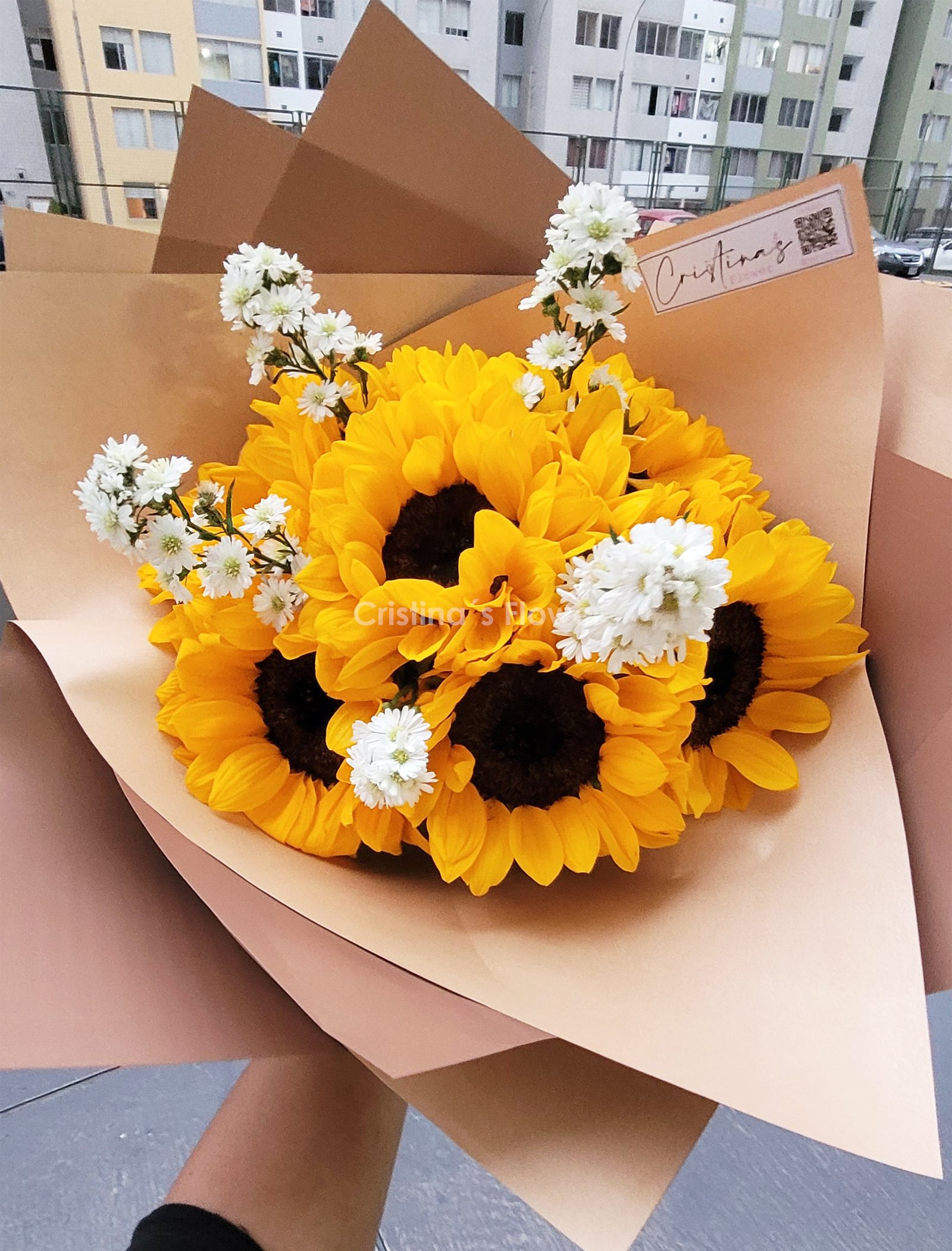 Ramo de 10 girasoles, acompañado de montecasinos blancos .