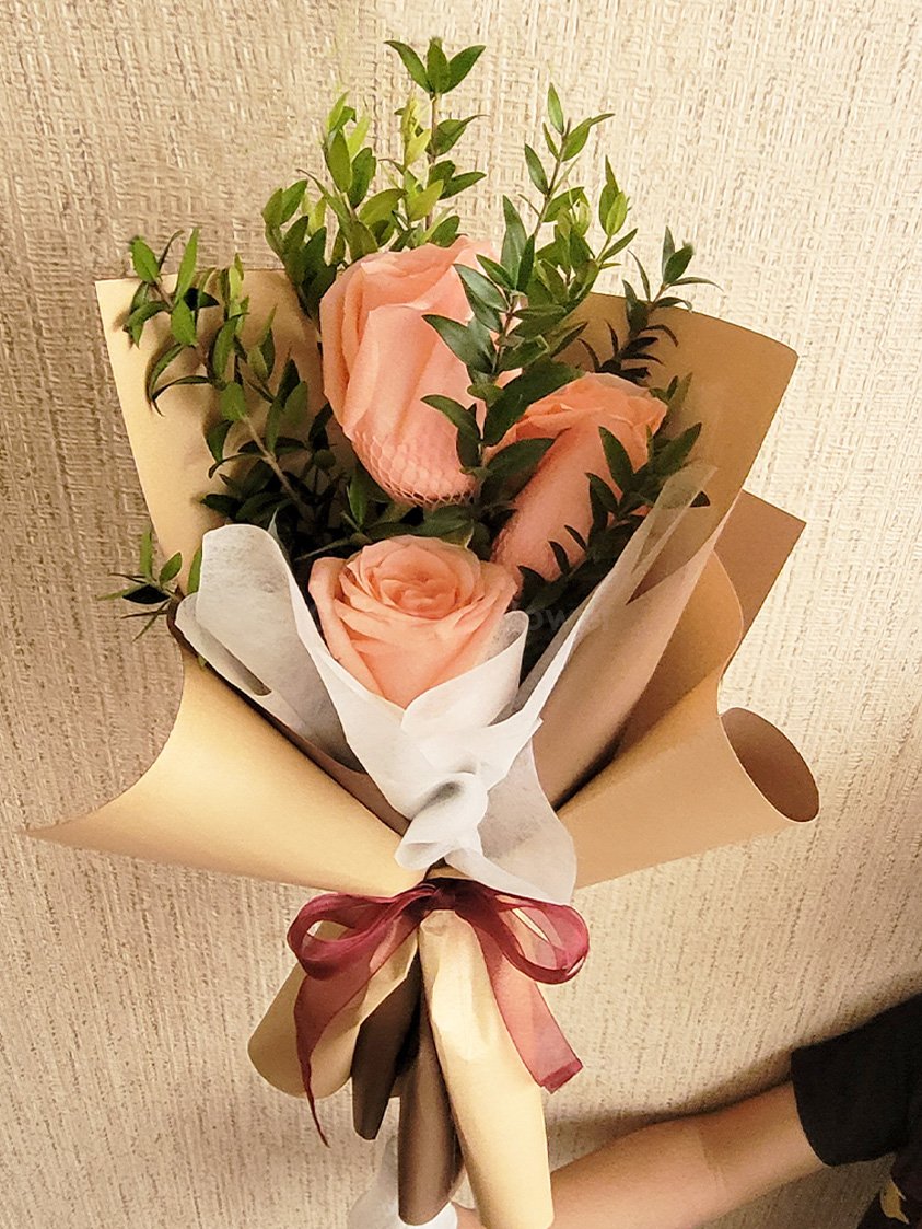 Ramo de 3 rosas., acompañado de follaje de estación.