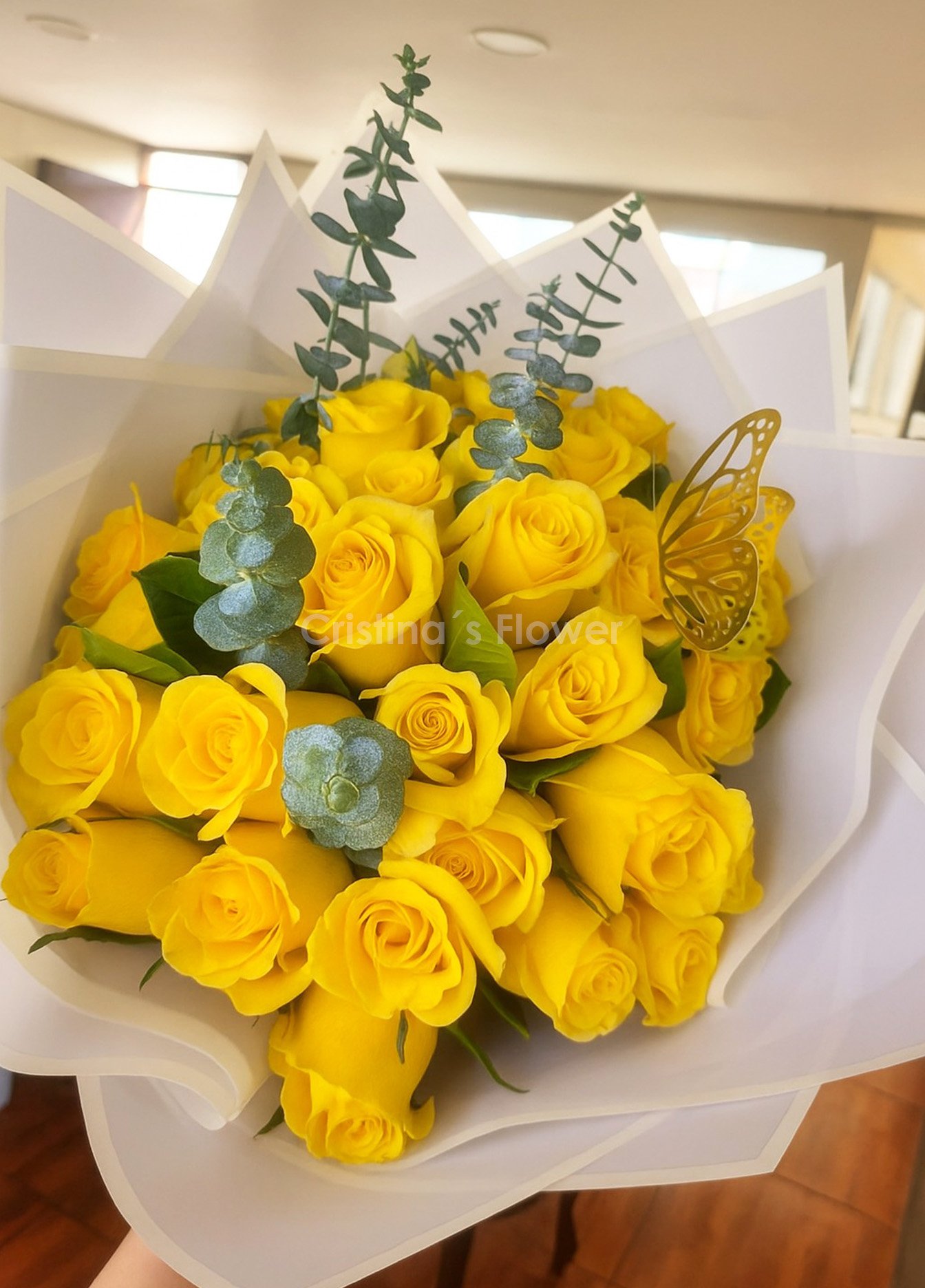 Ramo de 30 Rosas Amarillas, acompañado de detales en silver dollar y una mariposa de decoración.