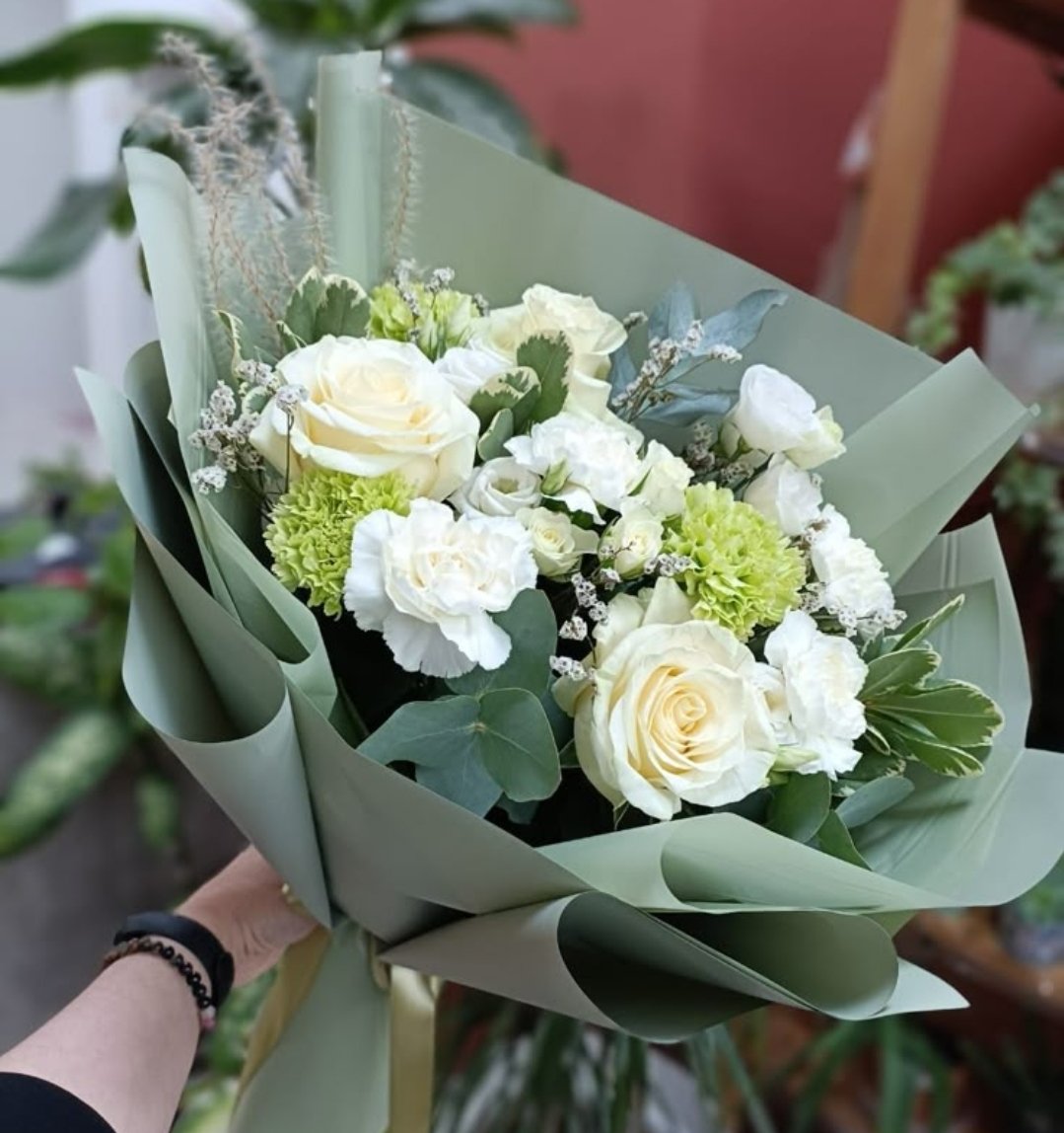 Ramo con 4 rosas, acompañado de mini rosas, claveles importados blanco (clavelones) y claveles nacionales verdes