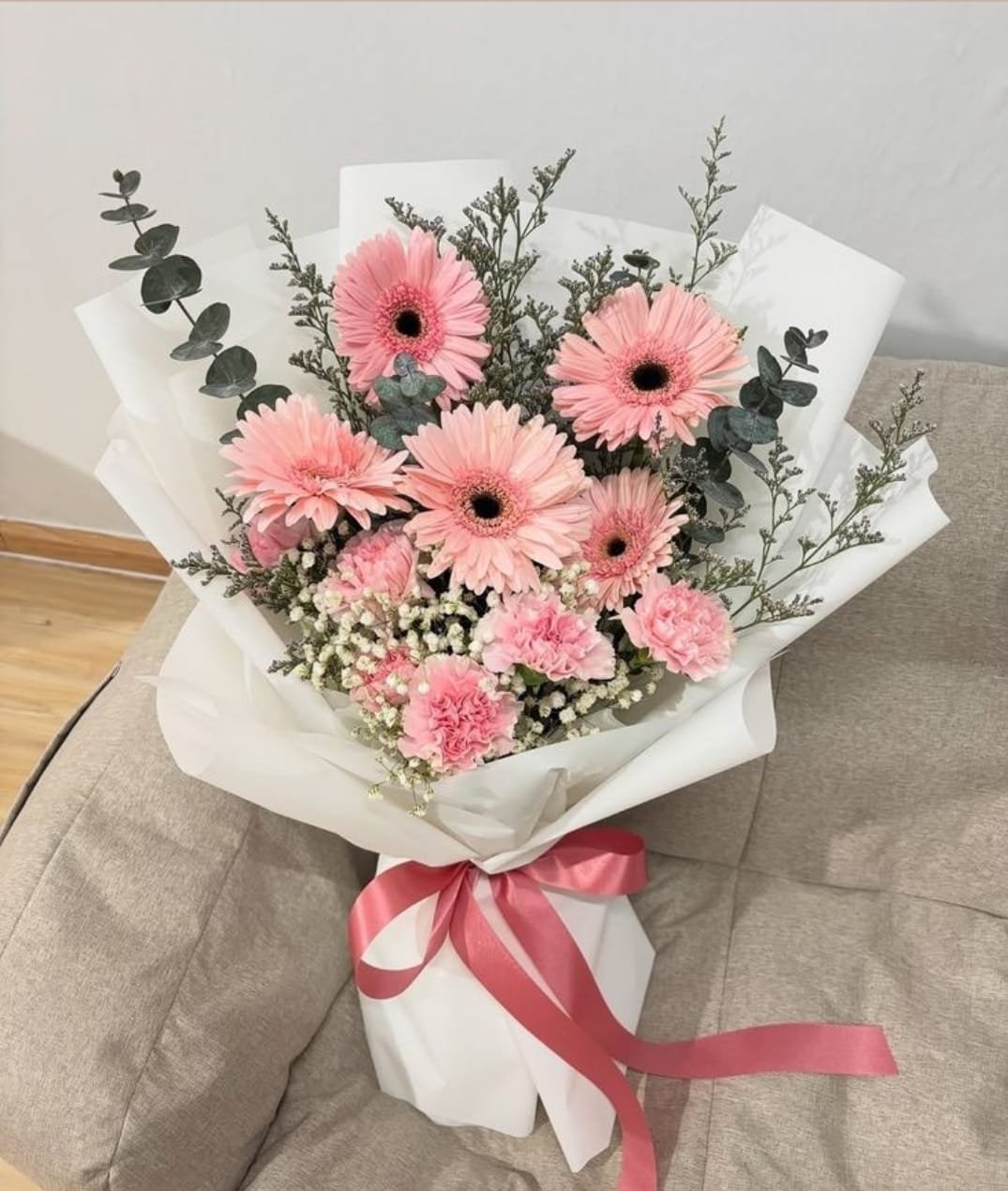 Ramo con 5 gerberas, acompañado con claveles, detalles de eucaliptos y gipsófilas.