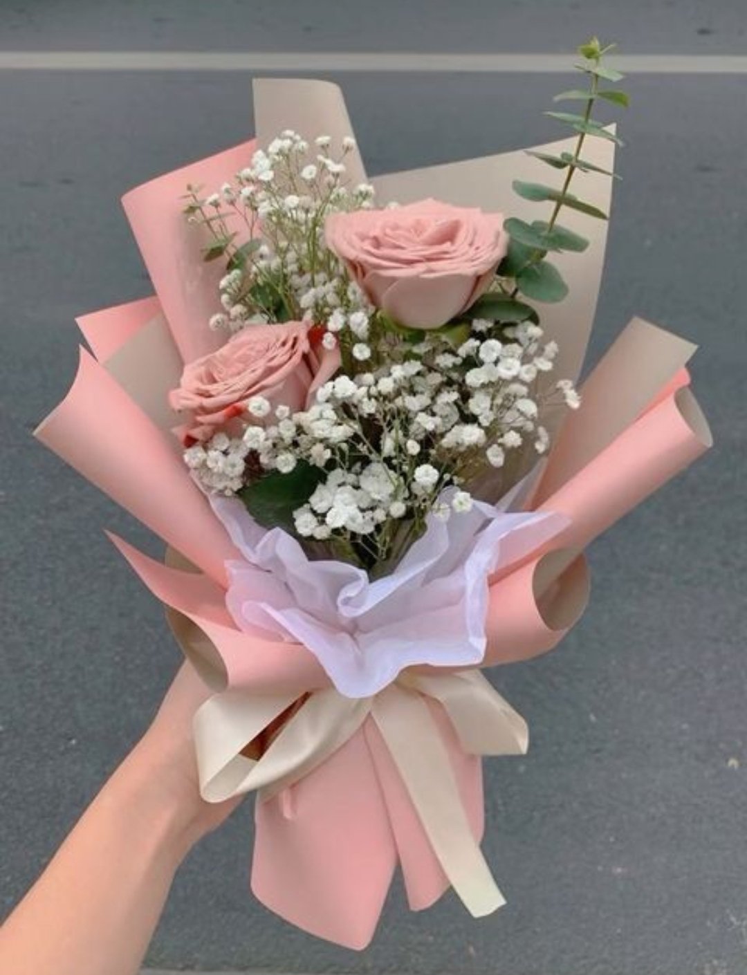 Ramo con 2 rosas, acompañado de gipsófilas y detalles de eucaliptos.
